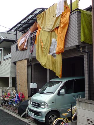 帰宅途中、家が近づくと雨が上がったので、早速ベランダでテントを広げました。