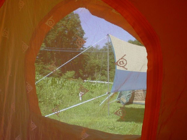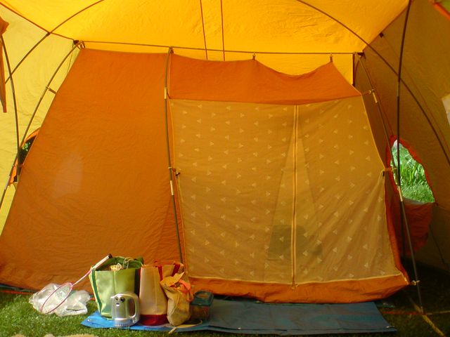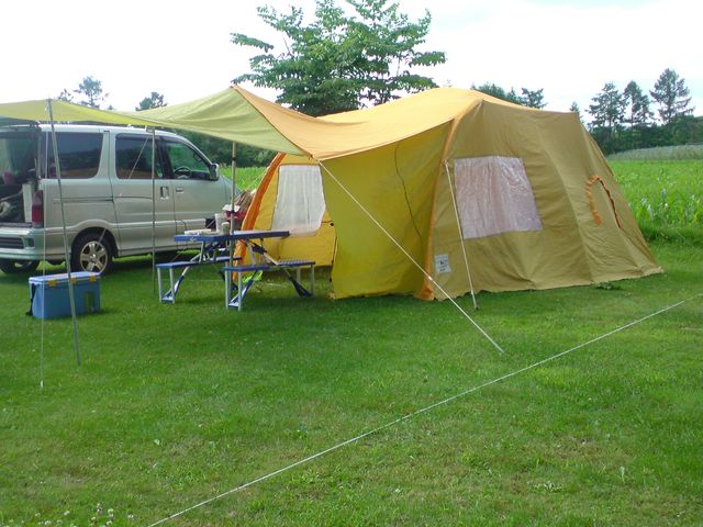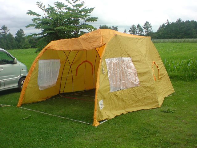 いまどきのドームテントのようにはいきませんが、なれればそんなに難しいものでもありあせん。